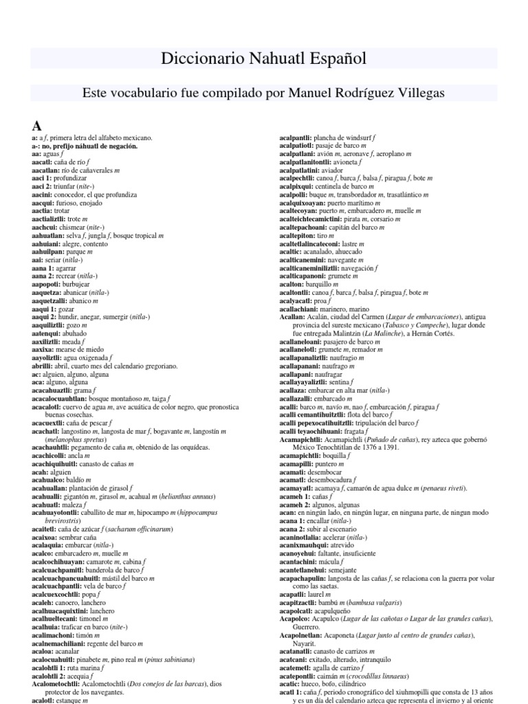 Este vocabulario fue compilado por Manuel Rodrguez Villegas. Traducciones en contexto de diccionario espaol-nhuatl en espaol-ingls de Reverso Context. Go to Google Play Now Diccionario espaol-nhuatl.