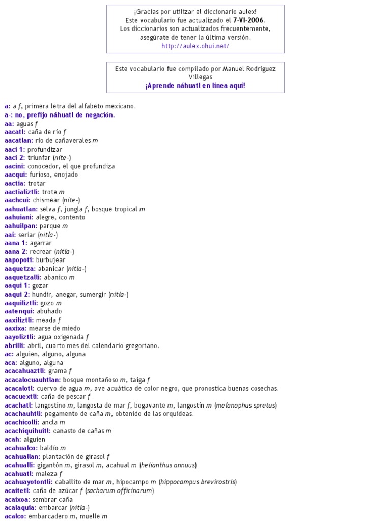 Aprende nhuatl en lnea aqu. Contiene un diccionario espaol-nhuatl pginas 1-100 ya nhuatl-espaol pginas 101-160 en el que las palabras en nhuatl estn escritas fonticamente. Diccionario nhuatl-espaol en lnea para autodidactas Aulex con ms de once mil entradas y una versin para descargar.